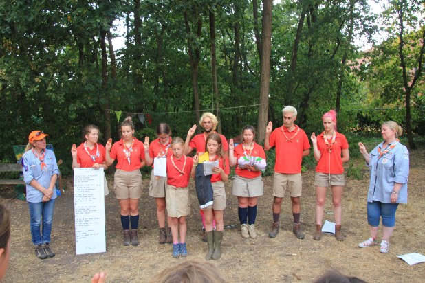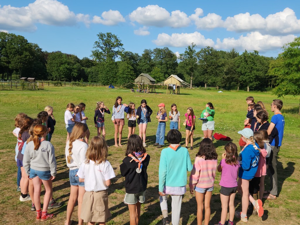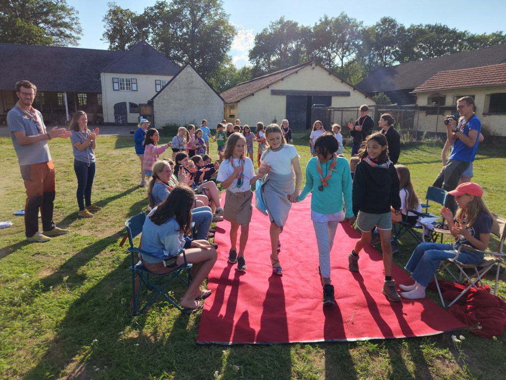 Après deux jours de pluies, nous retrouvons la ronde sous le soleil dans un superbe endroit de camp. Nous sommes arrivés à temps : le jeu des 4ème année, cheffes d’un jour à l’occasion de la journée à l’envers, est sur le point de se terminer ! Pour clôturer le jeu, elles ont organisé un grand défilé de mode auquel toutes les lutins participent. Des sourires et de nombreux fous rire résonnent sur le tapis rouge d’Arendonk !